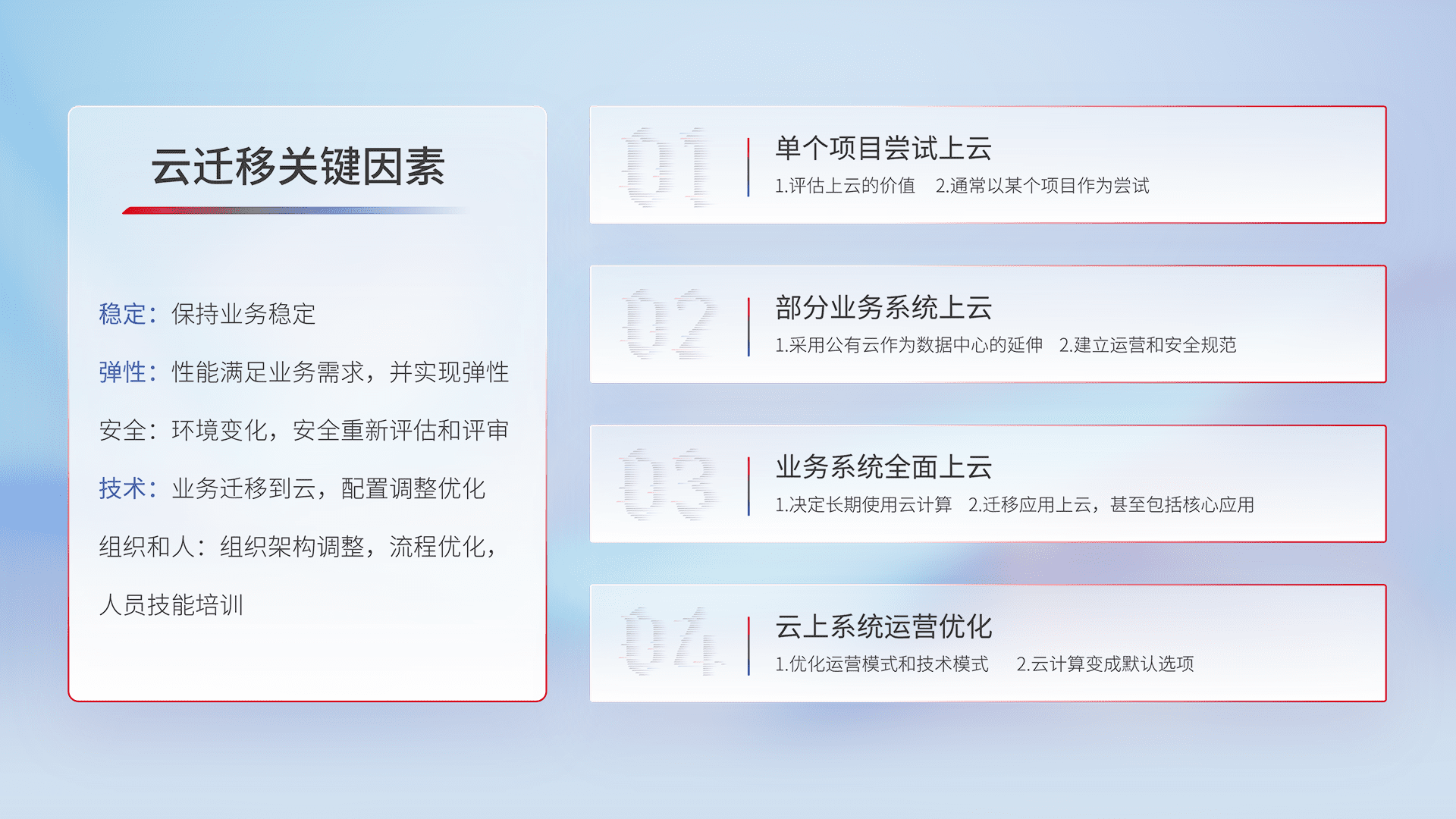 结合实际业务,,,从规划设计、、、、云平台选型、、、、云原生改造、、、、数据迁移、、集成交付,,迁移全过程为客户识别最佳上云路径,,做好风险识别管理,,,设计网络架构、、、身份权限、、、、安全审计合规、、操作审计、、、、日志审计、、监控告警策略、、、、多站点容灾设计等,,对云上基础设施进行整体规划,,,,提升IT治理水平,,以满足弹性、、、高可用、、、、高性能的需求。。
