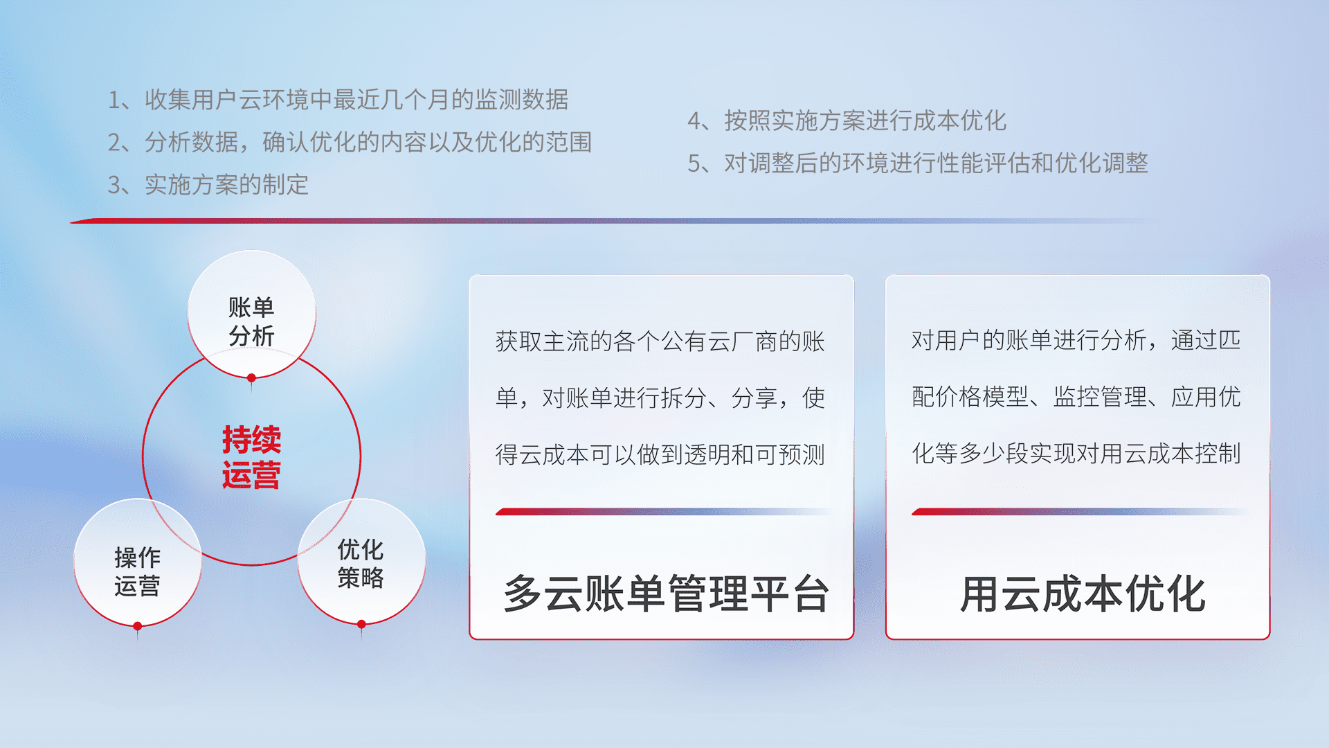 通过多云纳管,,,,以统一的资源数据模型把客户的云资源进行抽象和封装,,进而实现对多云资源的统一操作,,,,保障云资源管理的可靠性、、、稳定性与可用性。。量身定制化运维内容,,配置、、、、开发运维、、、补丁管理、、备份、、、、监控、、认证和访问管理、、审计和日常巡检等,,,,保障在用云过程中的可靠度,,,,稳定度以及高可用率。。。
