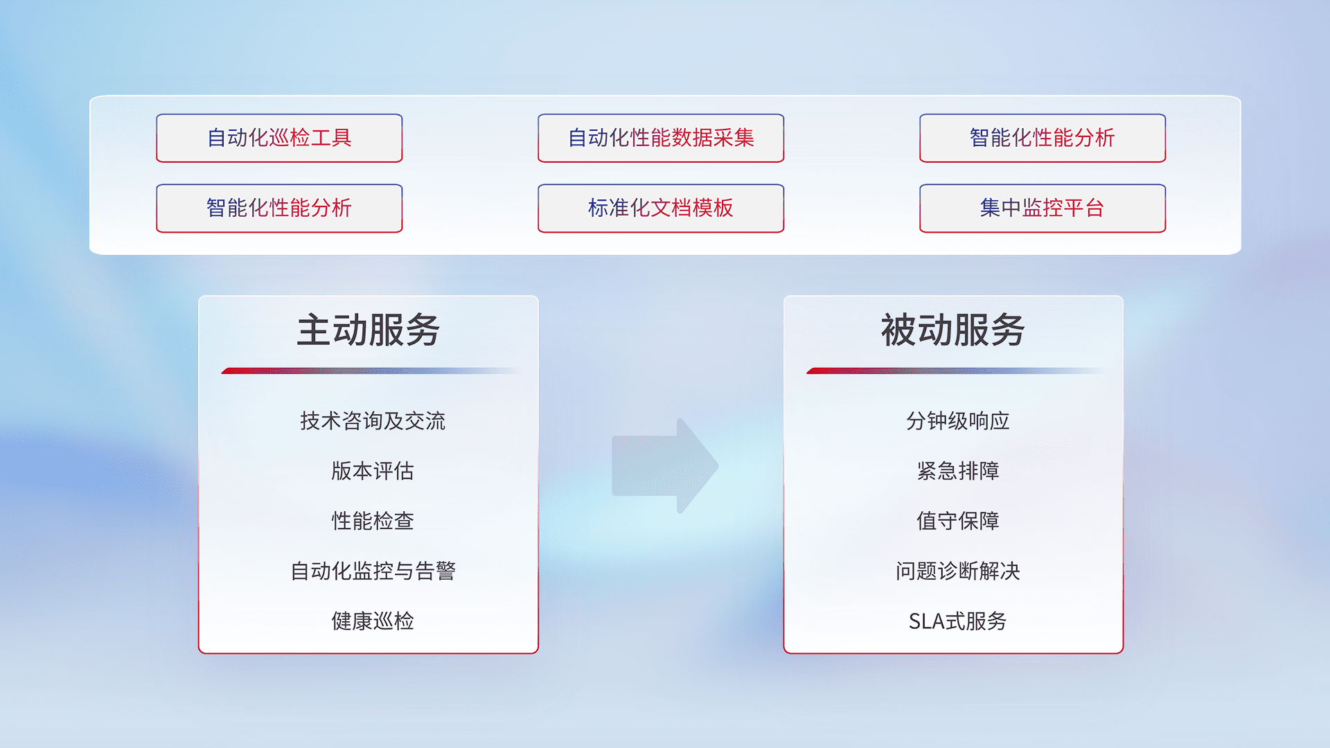 智能化工具和标准化文档,,,保障服务质量,,,提供主动服务(包含技术咨询、、、、版本评估、、、性能检查、、自动化监控与告警、、、、健康巡检)和被动服务包含(分钟级响应、、、、紧急排障、、值守保障、、、、问题诊断解决、、SLA服务)。。。。